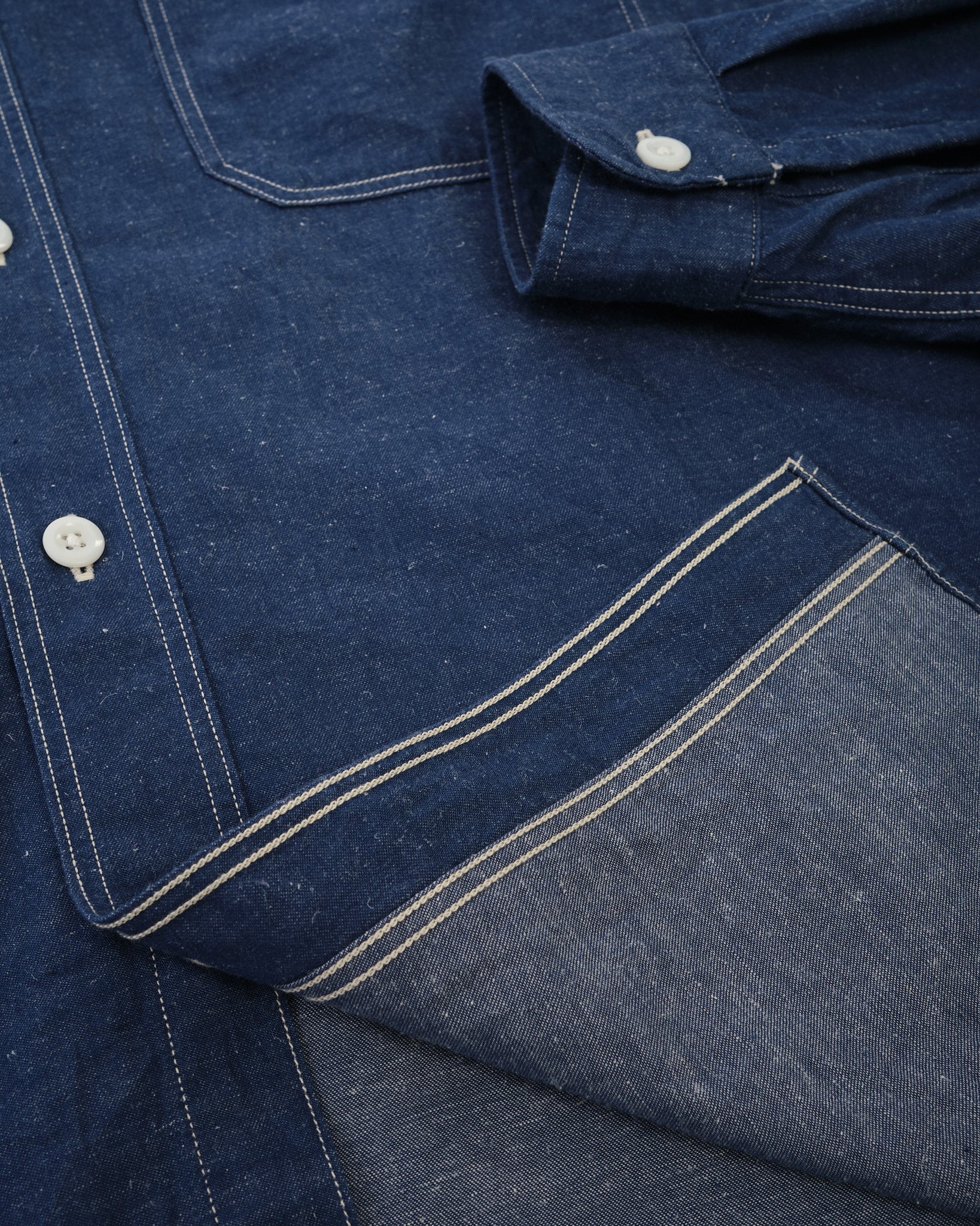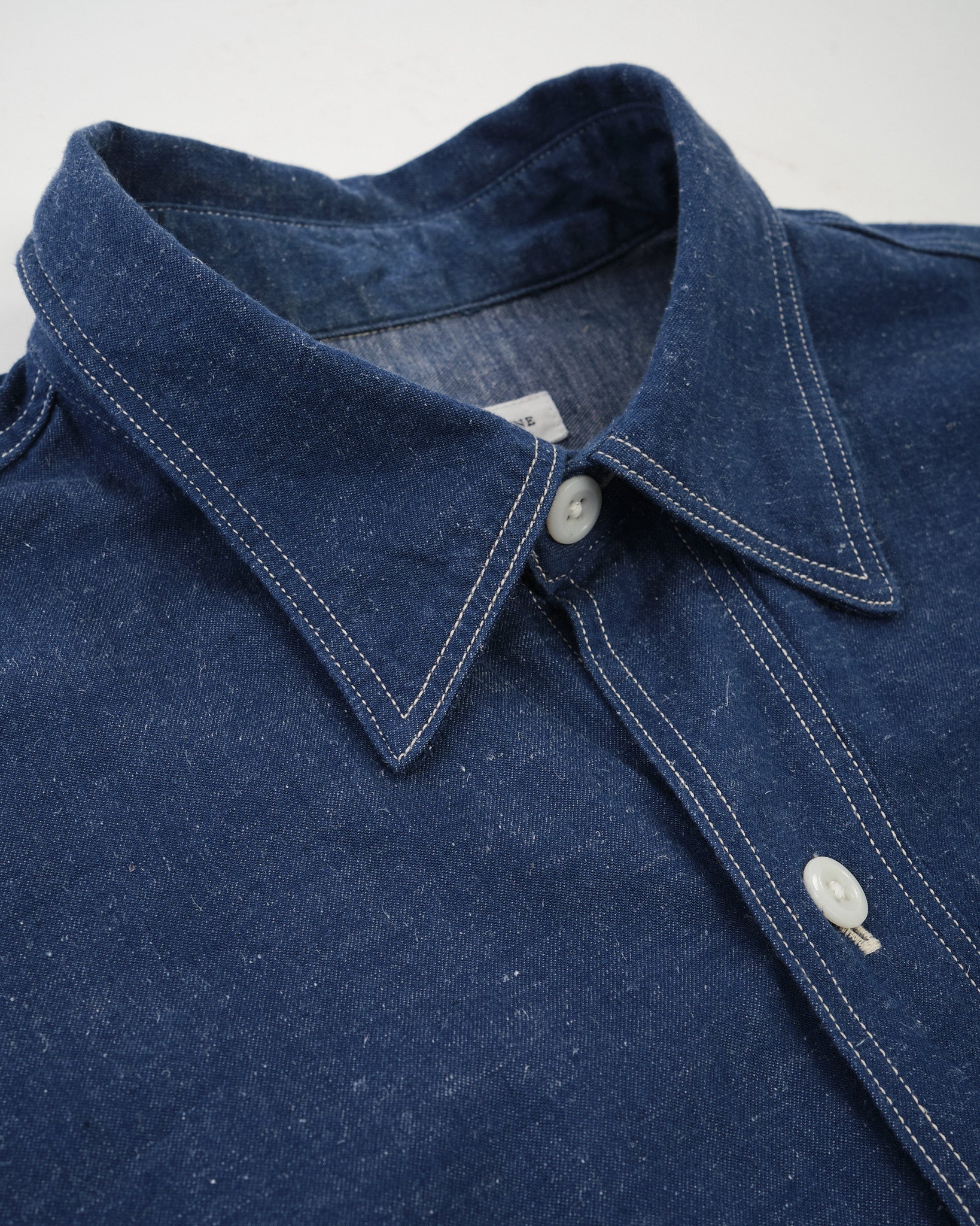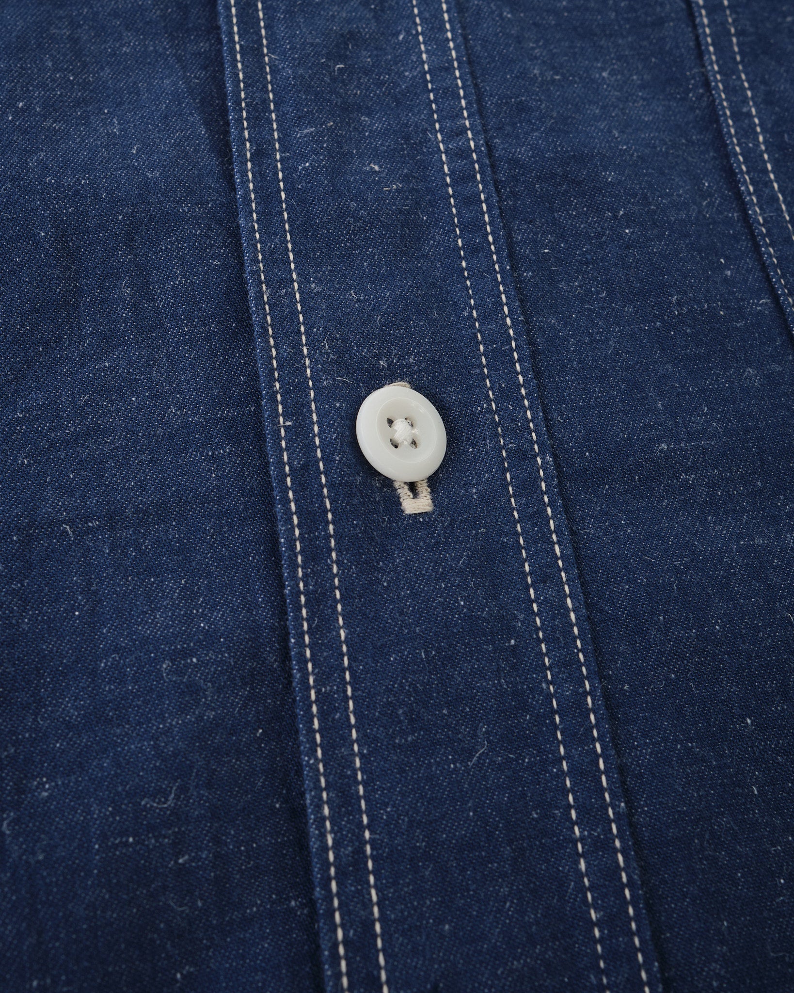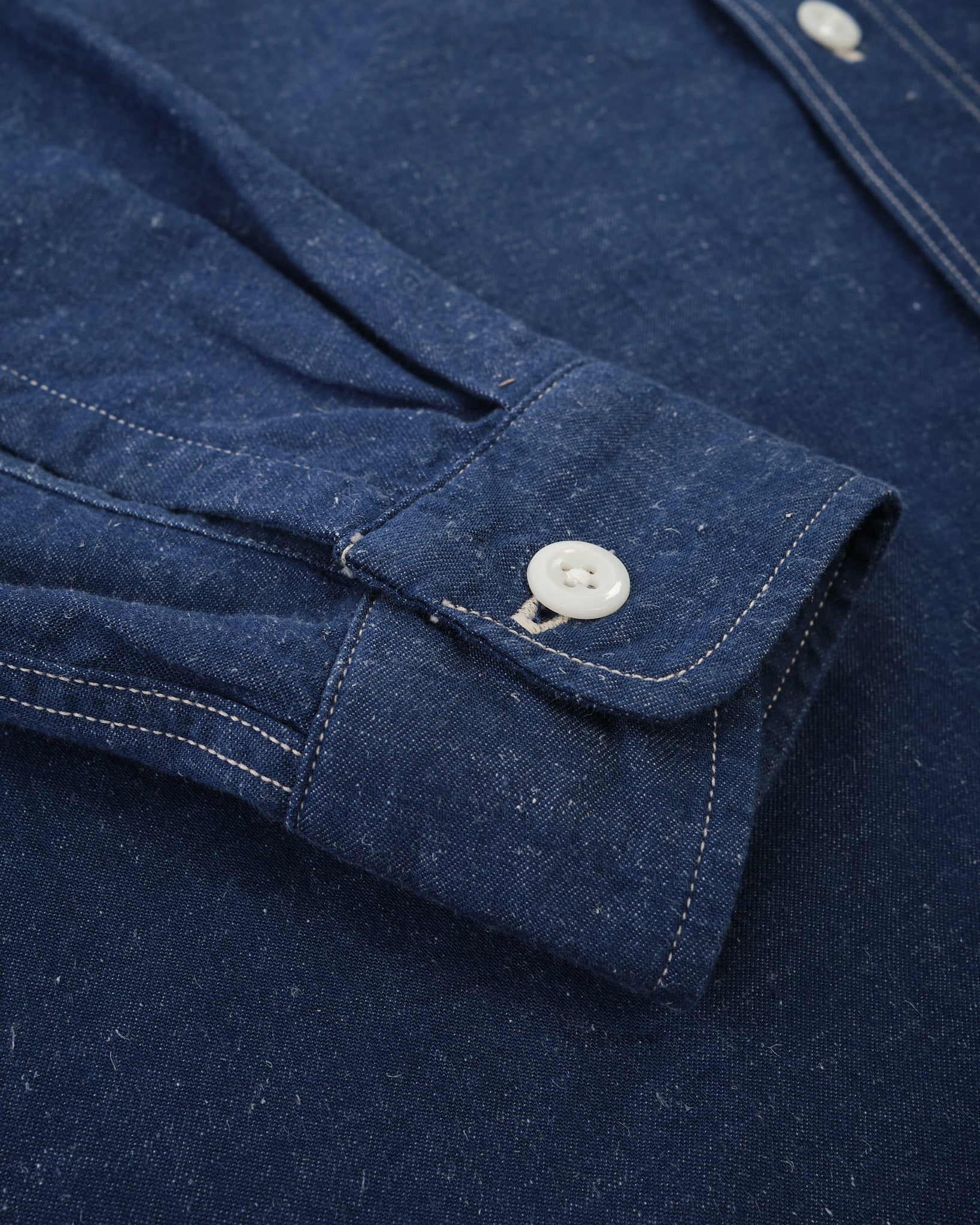 The KAPTAIN SUNSHINE Work Shirt (KSBSSH03) i Indigo Blå er et imponerende eksempel på arbejdstøj af høj kvalitet. Fremstillet med en blanding af ekstra-lang Suvin staple bomuld og hamp, er det originale garn farvet med indigo, hvilket giver en rig, dyb farve, der bliver smukkere over tid. Dette stof er vævet med høj densitet på en gammel skyttelvæv, langsomt inkorporerer luft i vævningen for tilføjet tekstur og holdbarhed. Resultatet er et materiale, der ikke kun ser godt ud, men udvikler sig med brug, bliver endnu mere unikt som tiden går.